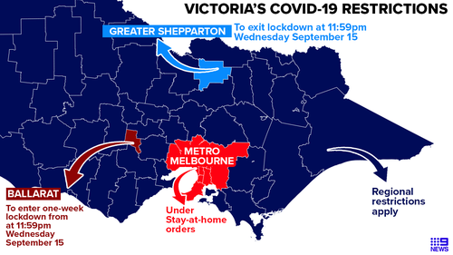 Lockdown restrictions will be lifted in regional Victoria from 1159pm on Thursday 9 September except for Greater Shepparton. Lockdown restrictions will remain. Regional Victoria excluding Greater.